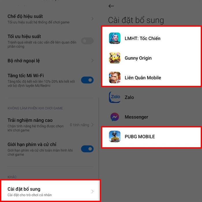 Bước 2: Chọn Cài đặt bổ sung > chọn game muốn điều chỉnh độ nhạy cảm ứng.