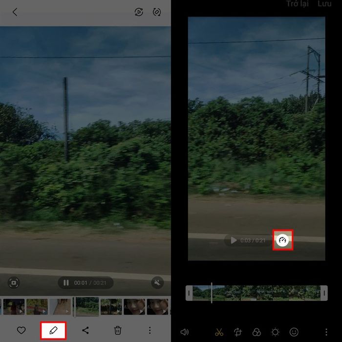 Bước 1: Mở ứng dụng Galeri trên điện thoại của bạn và chọn video bạn muốn chỉnh sửa. Tiếp theo, nhấn biểu tượng chỉnh sửa để mở các công cụ chỉnh sửa video. Ở giao diện chỉnh sửa video, bên dưới khung phát video sẽ có một biểu tượng dừng/phát cùng với thời gian đã phát, sau đó là nút điều chỉnh tốc độ video, nhấn vào đó