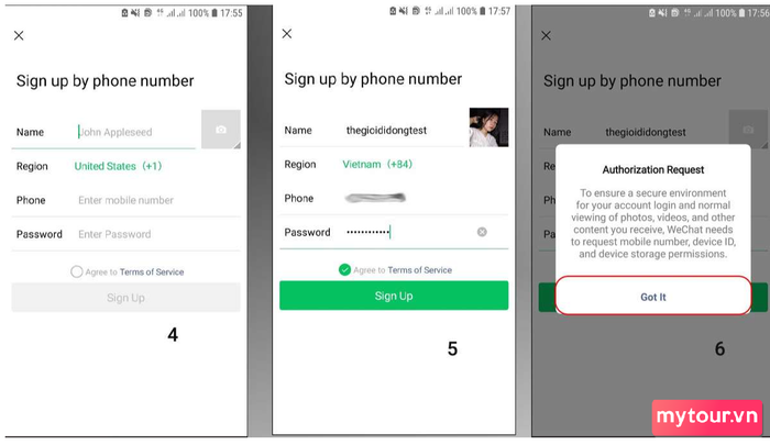 Bước 2: Xuất hiện bảng đăng ký, yêu cầu bạn cung cấp thông tin cá nhân. Hãy điền đầy đủ thông tin vào các ô tương ứng. Sau đó, đọc và đồng ý với các điều khoản của ứng dụng WeChat.