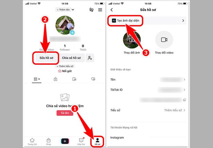 Bước 1: Khám phá ứng dụng TikTok trên điện thoại Android hoặc iPhone > Truy cập vào giao diện chính và mở mục Hồ sơ > Chọn Sửa hồ sơ > Chọn Tạo ảnh đại diện.
