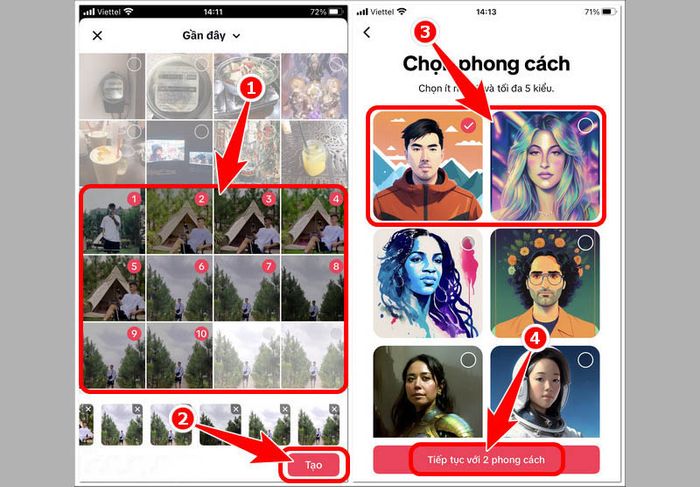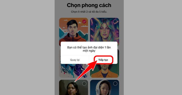 Bước 3: Lựa chọn từ 3 đến 10 bức ảnh chân dung yêu thích. Hãy chọn những hình ảnh thể hiện rõ đường nét khuôn mặt của bạn > Chọn Tạo > Lựa chọn từ 2 đến 5 phong cách khác nhau mà bạn cảm thấy phù hợp > Chọn Tiếp tục với 2 (hoặc 5) phong cách.