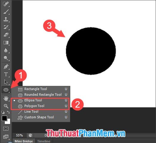 Bước 1: Nhấp chuột vào Shapes (1) => chọn Elipse hoặc Polygon Tool (2) để tạo hình. Bạn click và vẽ 1 hình ảnh (3) để tạo khung chữ.