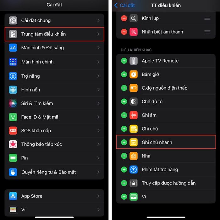 Bước 1: Mở Cài đặt, chọn Trung tâm điều khiển, và thêm Ghi chú nhanh.