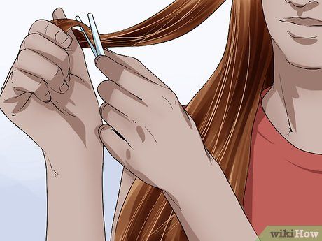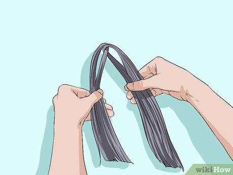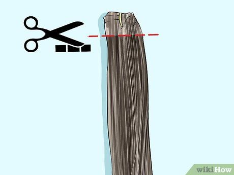 Cắt các lọn tóc nối ra khỏi phần đầu của gói. Gộp các lọn tóc lại để giữ cho chúng thẳng. Cắt ở phía dưới phần cuống (nơi để cột lọn tóc lại) và loại bỏ phần cuống thẳng.