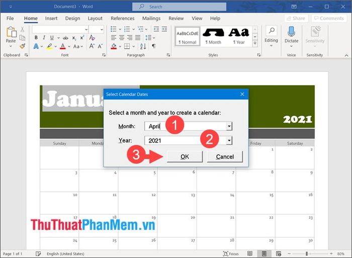 Bước 2: Chọn tháng (1) và năm (2) cho lịch bạn muốn tạo => OK (3) để tạo lịch.