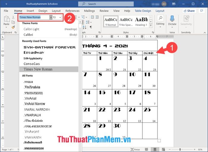 Bước 1: Nhấp vào bảng (1) => thay đổi Phông chữ và Kích thước chữ (2) để tạo nên bộ lịch độc đáo. Nếu máy tính chưa cài font đẹp, hãy xem bài viết sau và tải font yêu thích của bạn: Tổng hợp font chữ tiếng Việt đẹp cho Photoshop