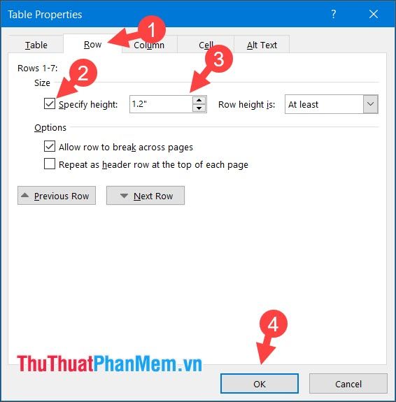 Bước 3: Chuyển đến thẻ Hàng (1) => Đánh dấu chọn Chỉ định Chiều Cao (2) và thay đổi chiều rộng ô trong khoảng 1-1,2 inch (3) hoặc tầm 2,5-3 cm. Ấn OK (4) để áp dụng thay đổi.