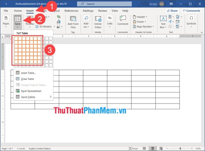 Bước 1: Mở menu Chèn (1) => Chọn Bảng (2) => Lựa chọn kích thước bảng theo chuẩn là 7x7 (3).