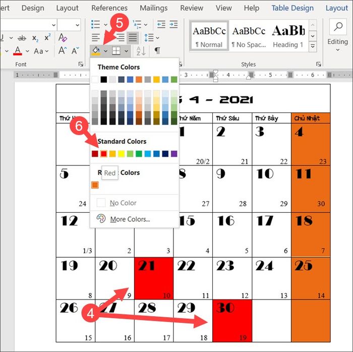 Tiếp theo, bôi đen ngày lễ (nếu có) (4) => Shading (5) => chọn màu đỏ (6) để tô màu cho ngày lễ.