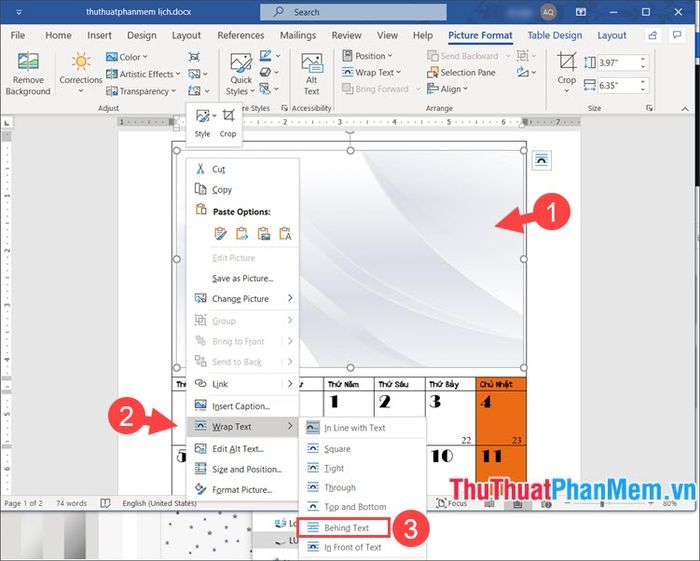 Bước 5: Chuột phải vào hình vừa thêm (1) => Bọc Text (2) => Đằng sau Text (3).