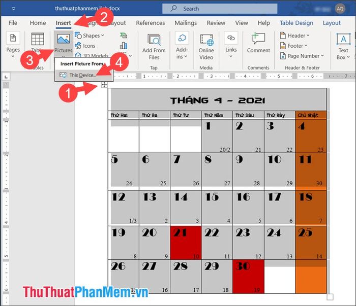 Bước 3: Nhấp vào biểu tượng mũi tên 4 hướng để bôi đen bảng (1) => Chèn (2) => Hình ảnh (3) => Thiết bị này… (4).