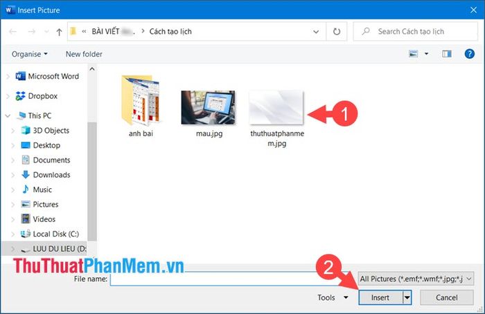 Bước 4: Chọn hình nền (1) => Chèn (2).