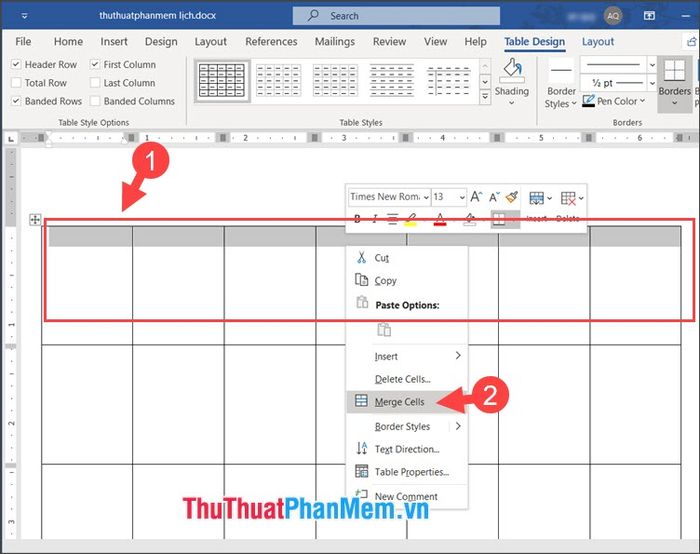 Bước 4: Bôi đen hàng trên cùng (1) và nhấp chuột phải vào bảng, chọn Gộp Ô (2) để tạo ô tiêu đề lịch.