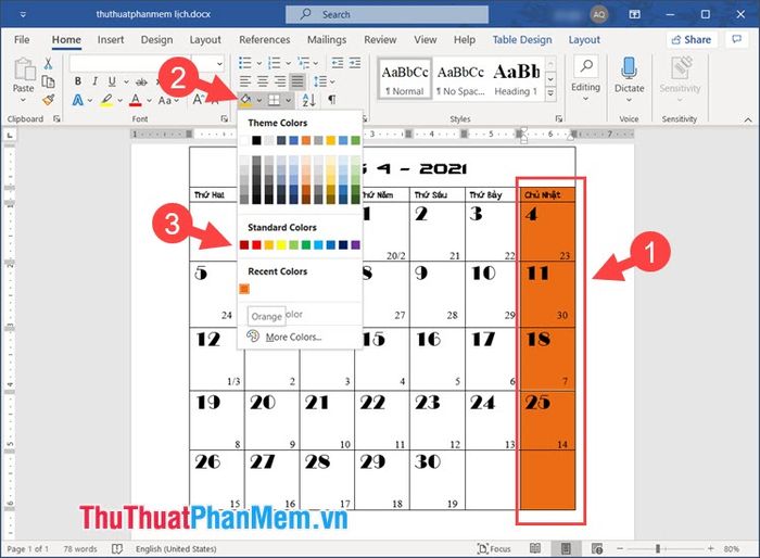 Bước 2: Tô màu cho cột Chủ Nhật bằng cách bôi đen cột Chủ Nhật (1) => chọn biểu tượng đổ màu nền cho ô Shading (2) => chọn màu sắc yêu thích (3).