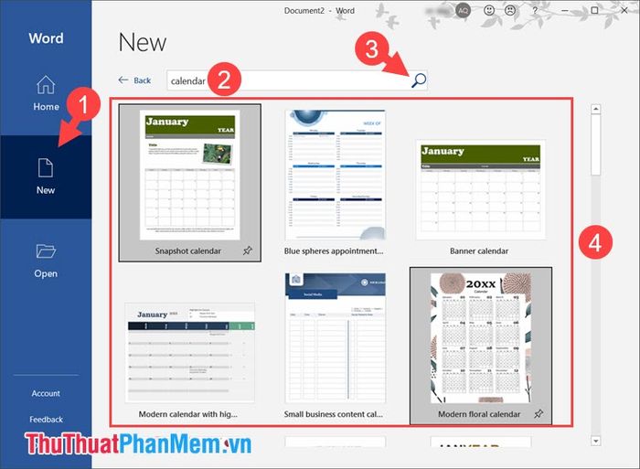 Bước 1: Mở Word và nhấn vào Mới (1) => tìm kiếm theo từ khóa lịch (2) và nhấn vào Tìm kiếm (3). Chọn mẫu lịch ưa thích (4) và nhấn để mở mẫu.