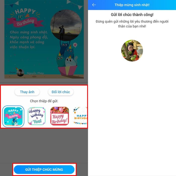 Bước 2: Tiếp theo, sẽ hiển thị một loạt mẫu thiệp dưới đây, bạn có thể thoải mái lựa chọn mẫu ưng ý và thêm những lời chúc của mình. Nếu không hài lòng, bạn có thể nhấn vào Đổi lời chúc để chỉnh sửa. Khi đã hoàn tất chỉnh sửa thiệp, hãy nhấn vào Gửi thiệp chúc mừng. Cuối cùng, khi gửi thành công, bạn sẽ nhận được một thông báo như trong hình bên dưới.