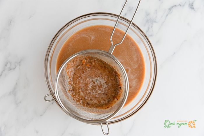 – Bước 5: Đổ hỗn hợp qua lưới lọc mịn để thu được nước tinh khiết. Sau đó thêm đường và một muỗng nhỏ tinh chất vani, khuấy đều.