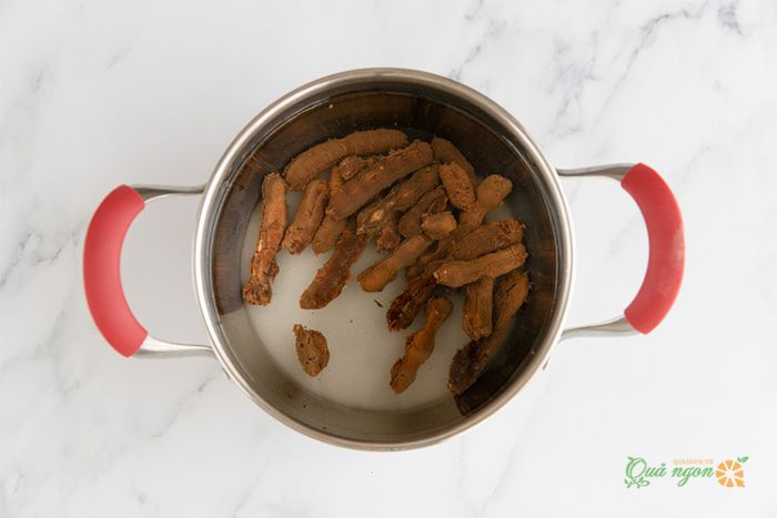 – Bước 3: Sau khi nước sôi, tắt bếp và đặt phần thịt trong quả me vào nước. Ngâm me trong khoảng 30 phút.