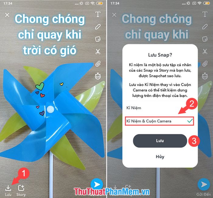 Bước 5: Di chuyển ảnh gif đến vị trí phù hợp và bấm Lưu (1). Chọn Kỉ niệm & Cuộn Camera (2) và bấm Lưu (3). Mở Thư viện ảnh để xem và chia sẻ chúng lên mạng xã hội.