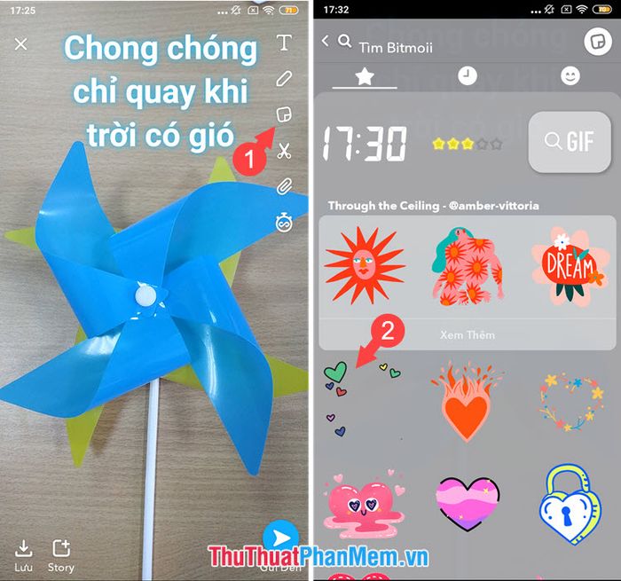 Bước 4: Thu nhỏ văn bản bằng cách chạm 2 ngón tay vào vùng văn bản và thu nhỏ. Chèn ảnh động .gif bằng cách chọn biểu tượng nhãn dán (1) ở góc bên phải. Chọn hình động phù hợp và chạm vào nó (2).