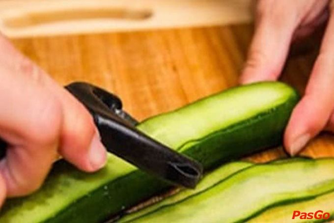 - Dưa chuột sau khi rửa sạch, cắt đầu và đuôi, chải sạch vỏ, sau đó ngâm trong nước muối loãng khoảng 30 phút. Sau đó, sử dụng dao nạo, cắt dưa chuột thành từng lát mỏng dọc theo chiều dài. Lát dưa chuột càng mỏng, bạn sẽ dễ cuốn sushi hơn vì chúng mềm và bám dính tốt hơn.