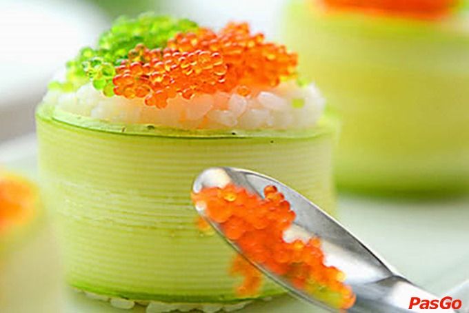 -	Rắc một ít trứng cá muối sao cho phủ đều mặt cơm, tạo điểm nhấn hấp dẫn.