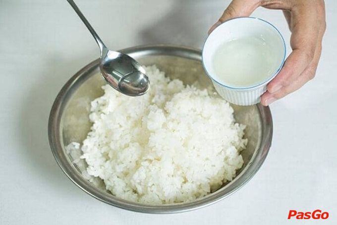 - Khi cơm còn nóng, rưới từng muỗng giấm sushi lên khắp bề mặt cơm, đảo đều bằng muỗng hoặc vá gỗ. Trong lúc trộn, quạt tay để giảm nhiệt độ.