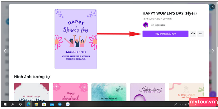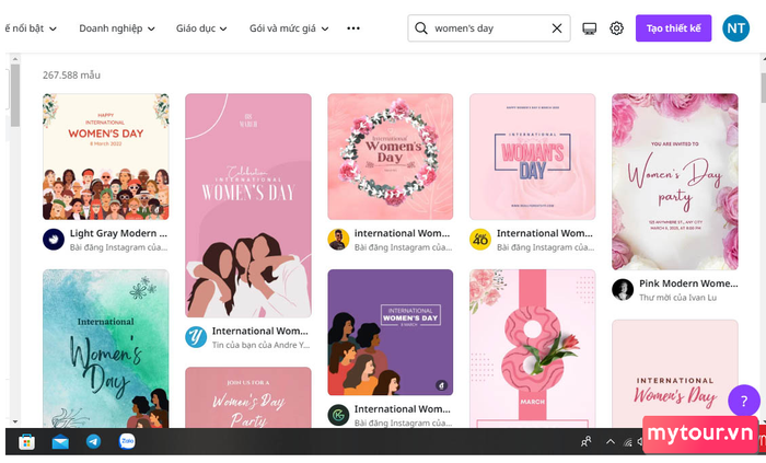 nhấn Enter. Tại đây, Canva sẽ hiển thị nhiều mẫu thiệp 8/3 đẹp mắt để bạn lựa chọn.