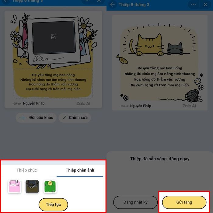 Bước 4: Phía bên dưới chúng ta sẽ có các loại thiệp, tìm và chọn vào tấm thiệp mà bạn yêu thích. Sau khi chỉnh xong nội dung cũng như hình thức của thiệp, hãy bấm vào Tiếp tục bạn nha. Chờ một lát để tấm thiệp của bạn được hoàn tất và khi nó được hoàn tất xong thì bạn sẽ có 2 lựa chọn là Đăng nhật ký và Gửi tặng. Chọn vào Gửi tặng rồi gửi nó đến người bạn cần gửi là được nha.