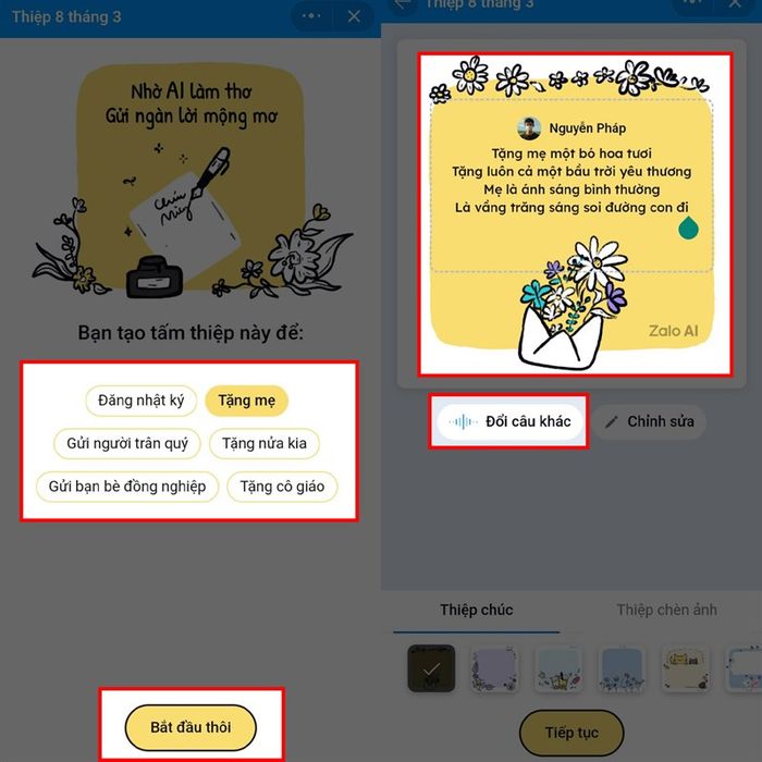 Bước 3: Bắt đầu làm thiệp, hãy chọn cho mình đối tượng mà bạn muốn gửi thiệp đến mẹ, người trân quý, nửa kia, cô giáo,... rồi ấn vào Bắt đầu thôi. Ở phía trên thì ngoài mẫu có sẵn thì bạn có thể ấn vào đó để chỉnh sửa thêm cho nội dung ghi trong thiệp của mình. Sẽ có nút Đổi câu khác, hãy chú ý và khi ấn vào nút này Zalo sẽ tự động đổi câu chúc khác cho bạn.