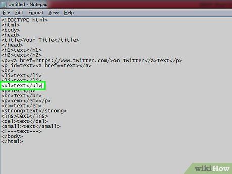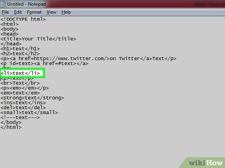 Tạo gạch đầu dòng đầu tiên. Nhập <li>Nội dung</li> và ấn ↵ Enter, đừng quên thay 'Nội dung' bằng nội dung của gạch đầu dòng.