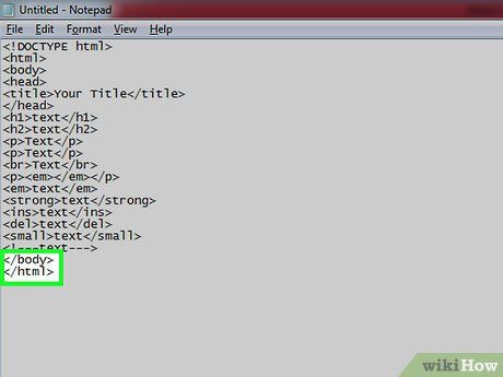 Đóng thẻ BODY và HTML của văn bản. Sau khi thêm nội dung, nhập </body> và ấn ↵ Enter, sau đó nhập </html> để kết thúc văn bản. Bây giờ nội dung trang của bạn gần như đã hoàn thiện, bạn có thể thêm các yếu tố khác như liên kết, đầu dòng và hình ảnh.
