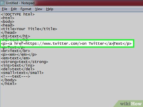 Đóng thẻ đường dẫn. Ngay sau nội dung bạn muốn làm đường dẫn, nhập </a>. Ví dụ, với dòng 'Theo dõi tôi trên Twitter' đã được liên kết với Twitter và chọn để làm đường dẫn cho 'trên Twitter', mã của bạn sẽ trông như sau: