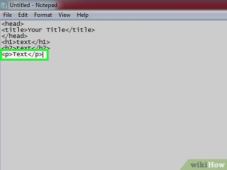 Tạo đoạn văn bản. Nhập <p>Nội dung</p> và ấn ↵ Enter; hãy thay thế 'Nội dung' bằng nội dung cần thêm.