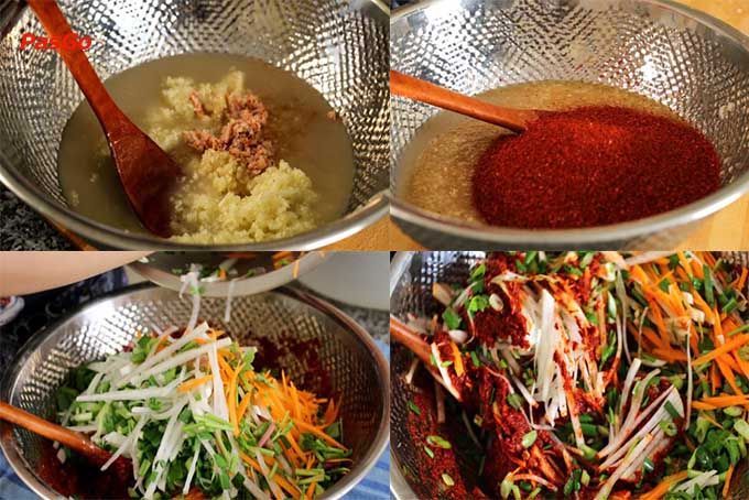 - Sau đó, thêm củ cải, cà rốt, hành tây, hành lá, lá hẹ và nước, trộn đều tay.