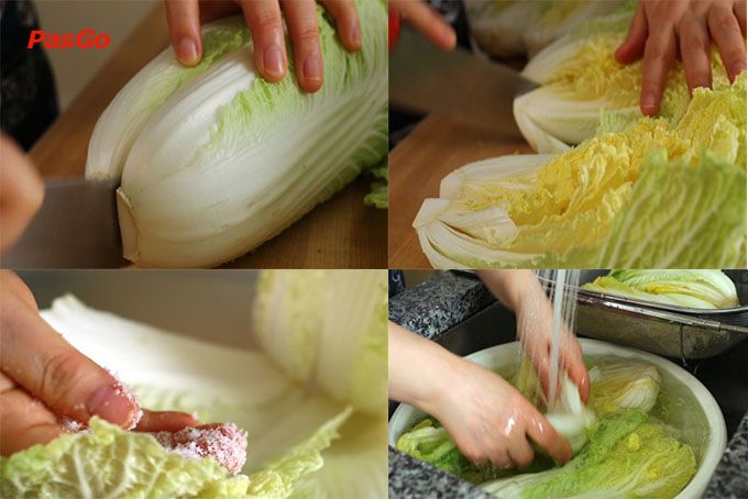- Chia mỗi cây cải thảo thành bốn phần nhưng không cắt phần lõi để giữ cải thảo chưa bị tách rời hoàn toàn.