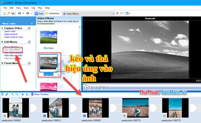 Bước 4: Trong tab Edite Movie, bạn chọn View video Effect. Thêm hiệu ứng vào ảnh bằng cách kéo và thả chúng vào ảnh ở dưới Storyboard.