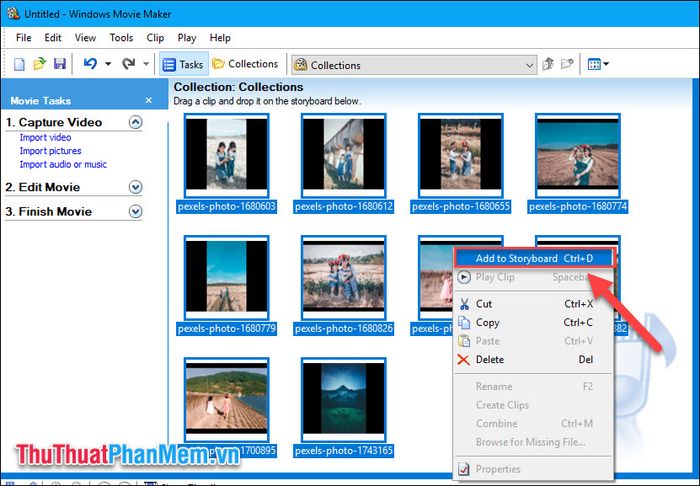 Bước 3: Khi các ảnh đã được thêm vào phần mềm, nhấn Ctrl + A để chọn tất cả các ảnh, sau đó click chuột phải và chọn Add to Storyboard.
