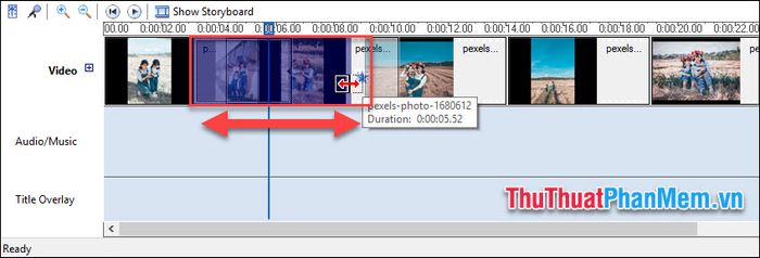 Kéo ra hoặc thu lại độ dài của ảnh trên Dòng thời gian để điều chỉnh thời gian hiển thị của ảnh, giữ chuột ở rìa ảnh và kéo.