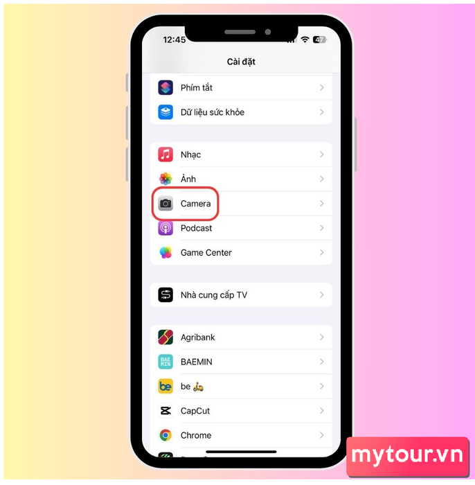 Bước 1: Mở Cài đặt trên màn hình chính, sau đó kéo xuống và tìm mục Camera.