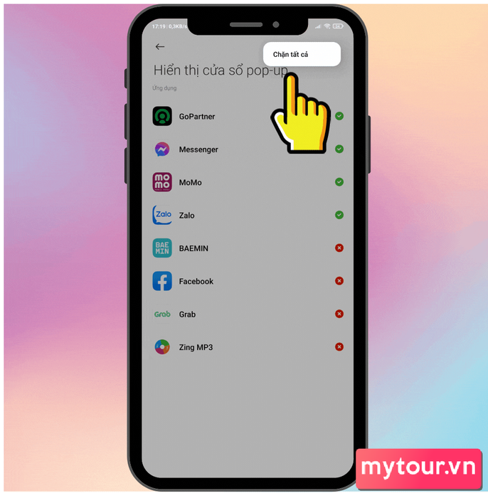Chọn tùy chọn Chặn tất cả >Khi có thông báo xuất hiện, bạn nhấn vào