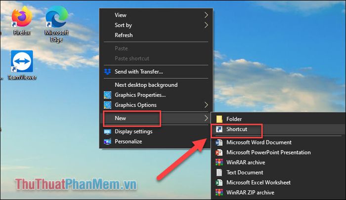 Đầu tiên, quay về màn hình Desktop của bạn. Tại đây, click chuột phải, chọn New >> Shortcut.