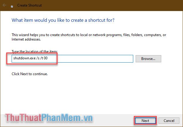 Cửa sổ Create Shortcut hiện ra, ở ô Type the location of the item, bạn điền vào: shutdown.exe /s /t 00.