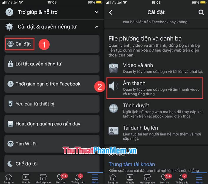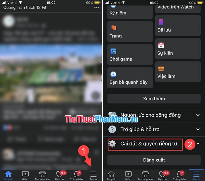 Chuẩn bị Bước 1: Trên Facebook iOS, bạn chạm vào ≡ (1) => Cài đặt & Quyền riêng tư (2).