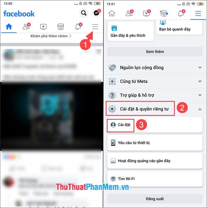 Khám phá Bước 1: Trên ứng dụng Facebook cho Android, hãy chạm vào biểu tượng ≡ (1) => Cài đặt & Quyền riêng tư (2) => Cài đặt (3).