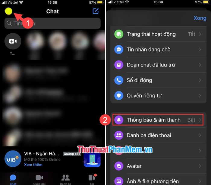 Thực hiện Bước 1: Bạn chạm vào hình đại diện (1) => Thông báo & âm thanh (2).