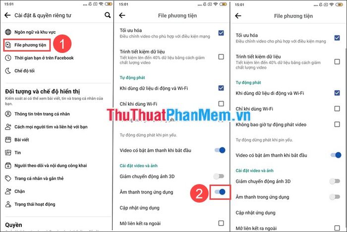 Thực hiện Bước 2: Bạn chọn mục File Phương tiện (1) => di chuyển công tắc Âm thanh trong ứng dụng (2) sang vị trí Tắt là xong.