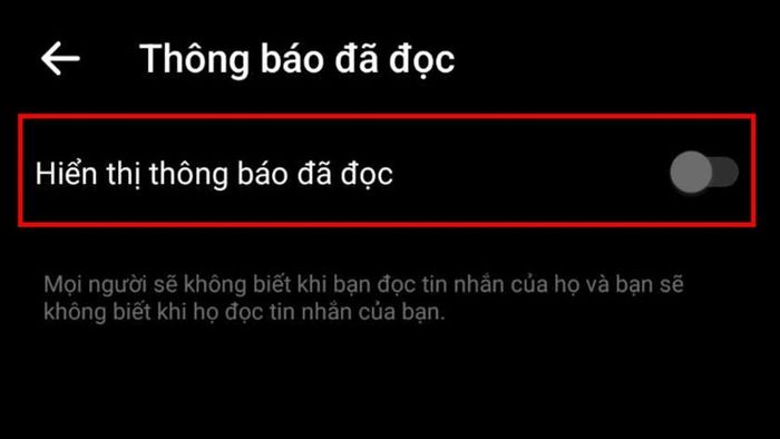 Bước 4: Cuối cùng, gạt công tắc của Hiện thông báo đã đọc sang trái để tắt tính năng này. Bây giờ bạn có thể thoải mái đọc tin nhắn mà không bị phát hiện đã xem trên điện thoại.