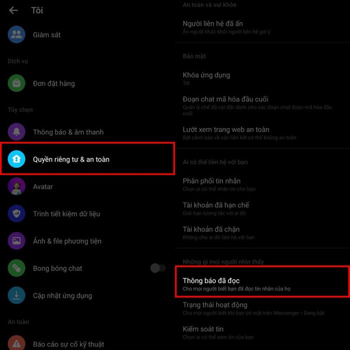 Bước 3: Kéo xuống và chọn Quyền riêng tư & an toàn >. Tìm mục Những gì mọi người nhìn thấy và vào Thông báo đã đọc.