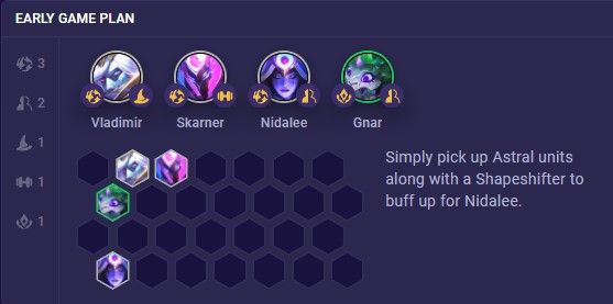 Đội hình này khởi đầu với Nidalee, Skarner và Vladimr để tạo sức mạnh 3 Thượng Long, sau đó thêm Gnar để kích hoạt hệ Hóa Hình